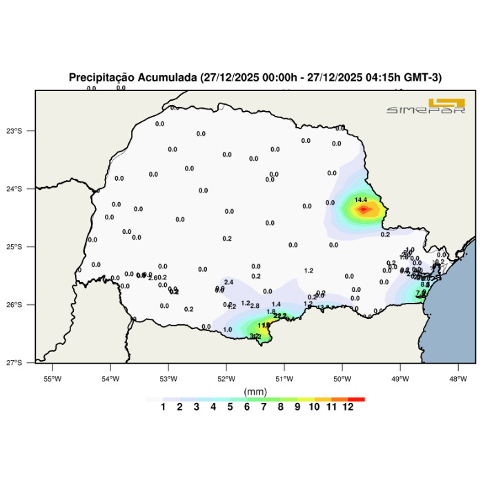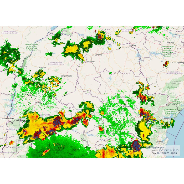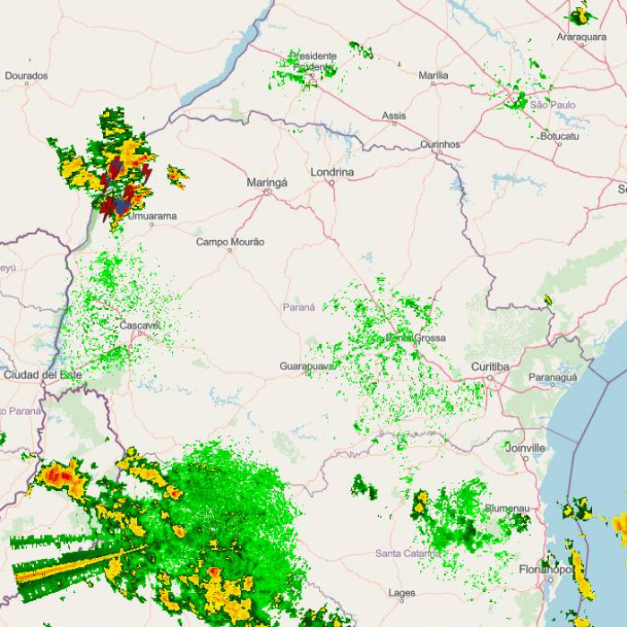 Durante a madrugada, pancadas de chuva atingiram o leste paranaense, ocorrendo de forma pontual e alcançando o Centro-Sul e o Litoral, com acumulados que não superaram 15 mm. No momento, os eventos cessaram, sem registro de novas pancadas de chuva.