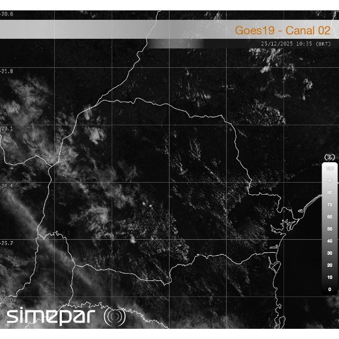 Manhã de Natal com rápido aquecimento no Paraná. Destaque para a elevação das temperaturas, que ficam bem mais altas durante a tarde, principalmente do leste a o norte do estado. No Litoral a sensação de calor é mais do que valores medidos nos termômetros, pois concentra muita umidade até a Serra do Mar. Nas próximas horas aumenta a instabilidade entre as áreas mais ao sul e oeste, com surgimento de nuvens de chuva, embora de forma localizada.