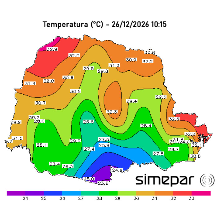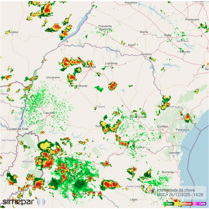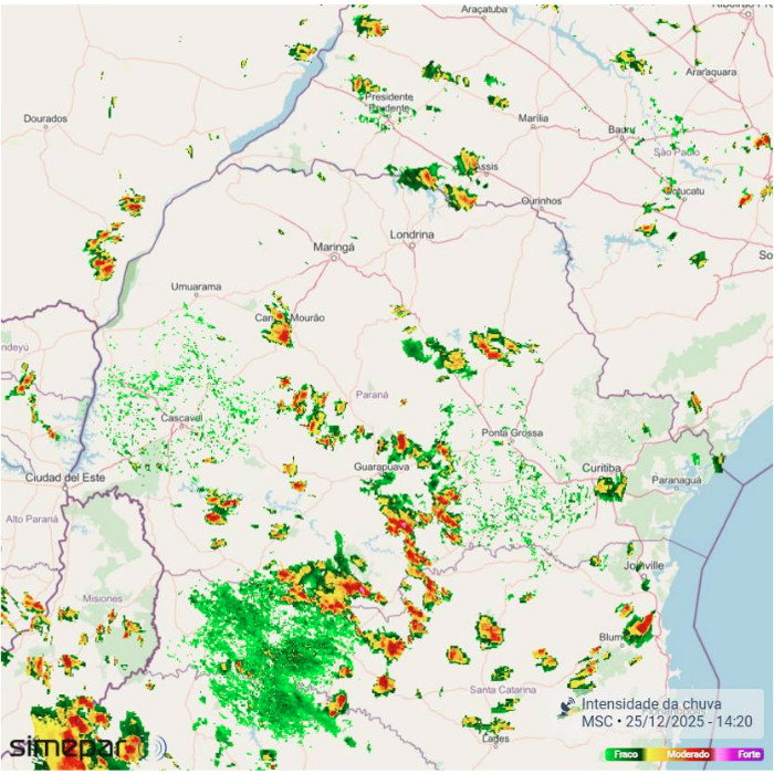 Mais uma tarde de calor no Paraná. O feriado de Natal é caracterizado por temperaturas elevadas e também por chuvas rápidas (de curta duração) e muito localizadas; ou seja, condição bem típica de verão. As temperaturas superam os 30°C na maioria dos municípios. Os radares meteorológicos detectam chuvas em vários setores do estado, porém, neste momento, com mais intensidade entre o Centro-Sul e o Sudoeste.