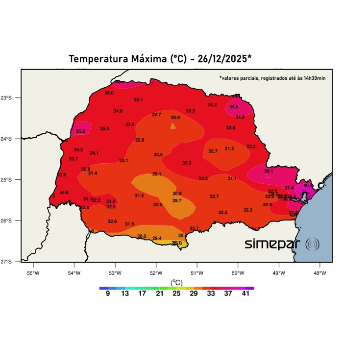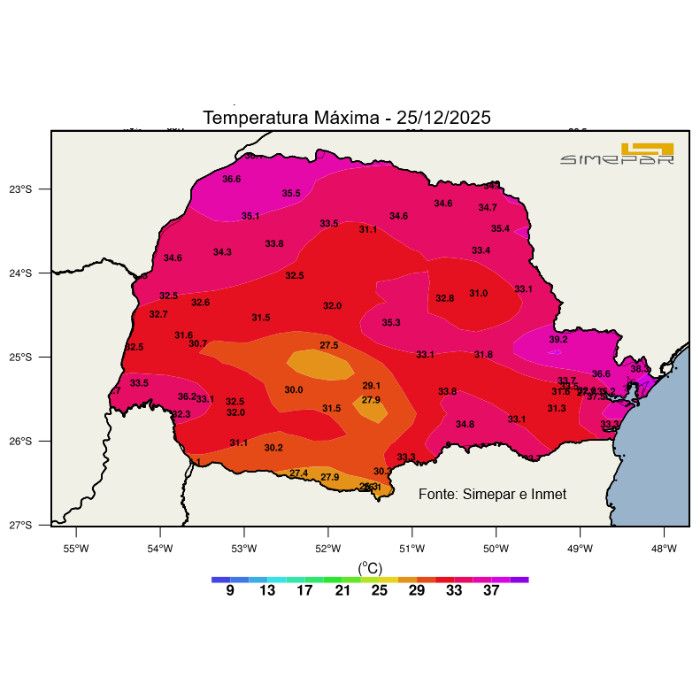Ao longo da tarde desta quarta-feira, vespera de Natal, o Paraná registrou recordes de temperaturas do ano em algumas localidades. Os destaque foram Morretes (Inmet) que registrou 39,5 ºC e Cerro Azul, 39,4 ºC. Mesmo com varios registros de chuvas isoladas no estado, as temperaturas ultrapassaram os 30 ºC em grande parte das regiões paranaenses. Nesta noite, ainda há registros de chuvas isoladas nas diversas regiões, sem registros de temporais. O mapa mostra as temperaturas máximas registradas no dia de hoje pelas redes de estações meteorológicas do Simepar e Inmet.