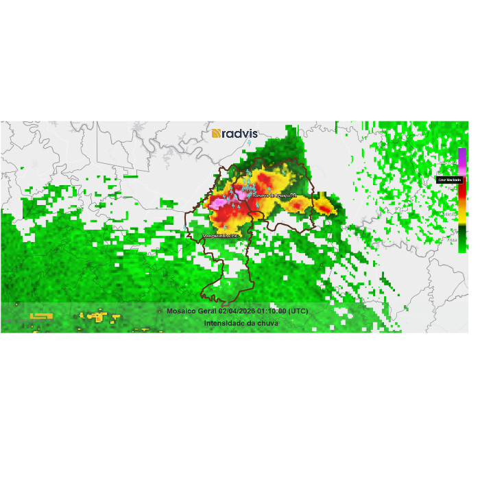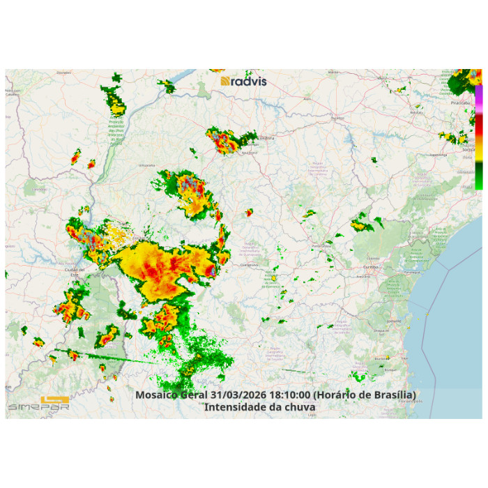 Neste momento, áreas de instabilidade atuam entre as regiões de Mangueirinha e Reserva do Iguaçu, no Sudoeste do Paraná. A imagem de radar indica núcleos de chuva com intensidade moderada a forte, com potencial para ocorrência de trovoadas, rajadas de vento intensas e descargas atmosféricas. Essas instabilidades atuam de forma localizada, podendo provocar chuva intensa em curto período de tempo nessas áreas nas próximas horas.