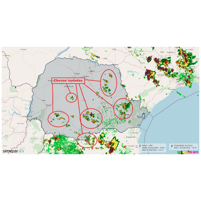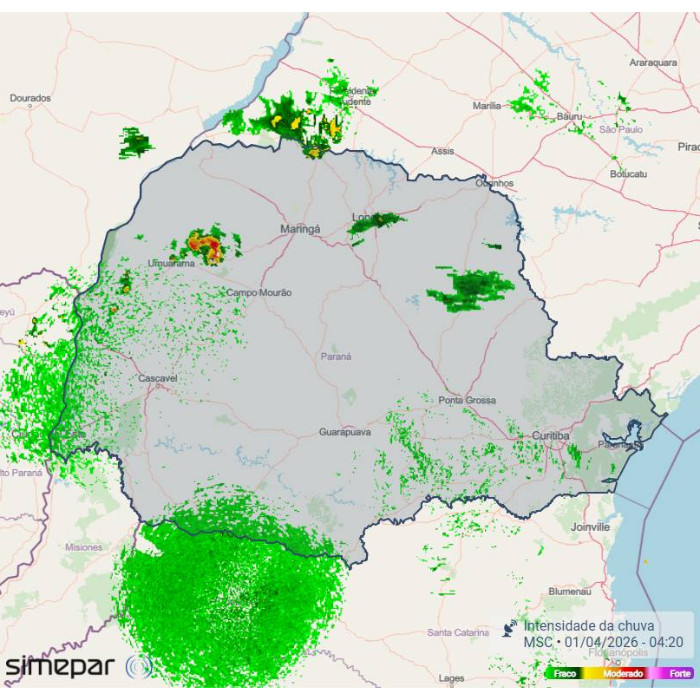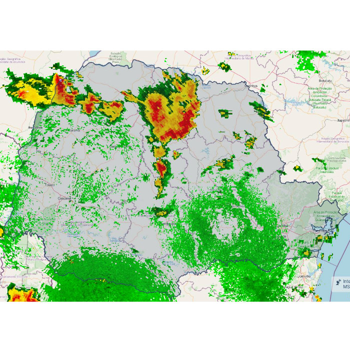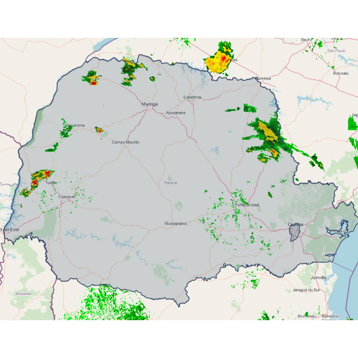 A imagem de radar meteorológico indica que as instabilidades seguem atuando sobre o estado do Paraná, mantendo a ocorrência de chuva com intensidade variando de moderada a forte, acompanhada por descargas elétricas. Os núcleos mais intensos se concentram entre as regiões Norte e Noroeste, com células convectivas bem organizadas e potencial para elevados volumes em curto intervalo de tempo. Entre os maiores acumulados registrados até o momento, destacam-se Morretes, com 53,8 mm, Maringá, com 69,8 mm, e São Miguel do Iguaçu, com 43,6 mm, evidenciando a irregularidade espacial das precipitações e o caráter localizado dos eventos mais intensos.