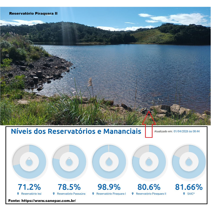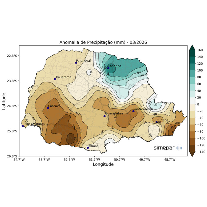 A anomalia de precipitação em março/2026 ficou negativa na maior parte do Paraná. Em vários setores esta diferença superou os 100 mm (Sudoeste e Litoral, por exemplo). Apenas no Norte a chuva superou os valores médios para o mês. Destaque para Londrina, onde choveu 262,4 mm (87,2 mm apenas no dia 09/03). Na RMC a diferença entre o volume registrado em março/2026 e a média histórica também ficou negativa, com valores entre 60 e 80 mm. Apesar desta condição, os níveis dos reservatórios que atendem a região seguem com valores acima dos 70 %.