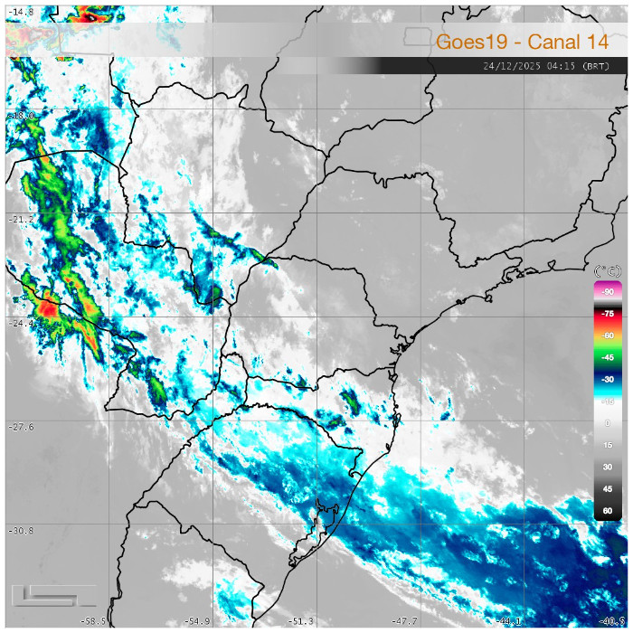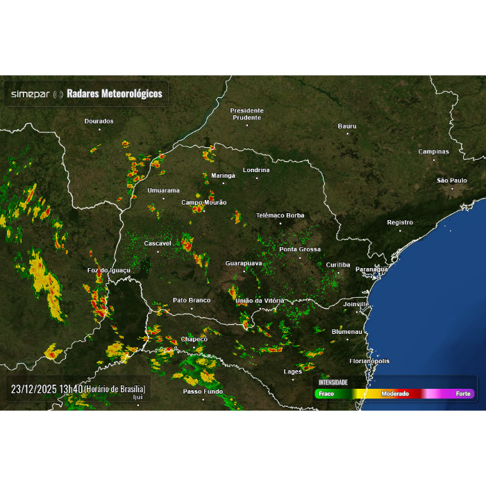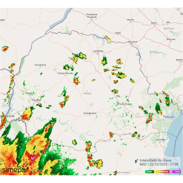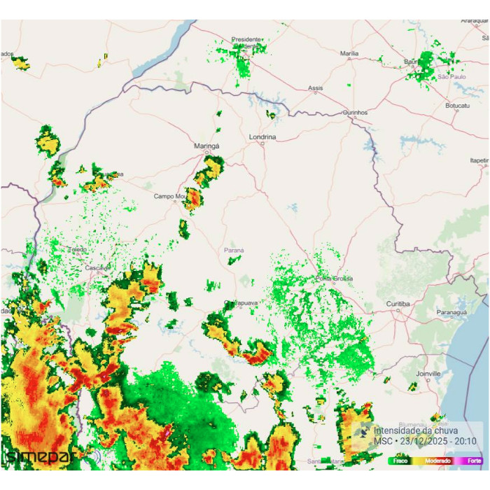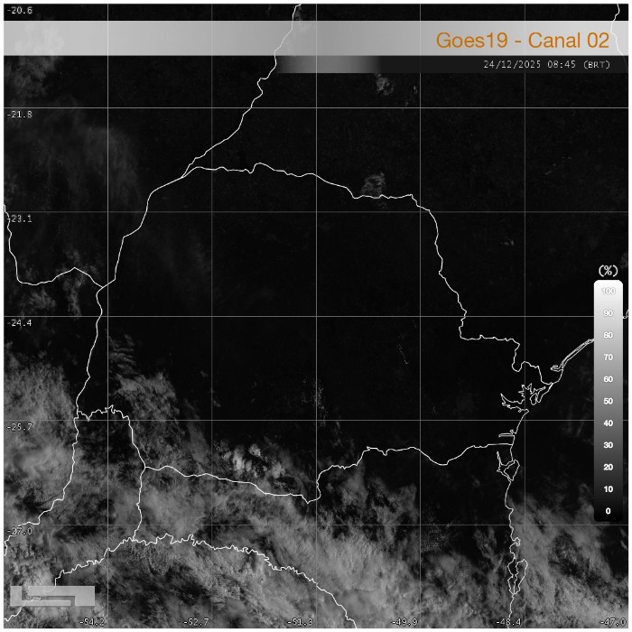 As pancadas de chuva isoladas persistiram sobre o sul do Paraná durante a madrugada, apresentando enfraquecimento gradual no início da manhã. No momento, observa-se cobertura de nuvens pontuais atuando principalmente nas regiões Oeste e Sudoeste do estado, sem indicativos de organização significativa.