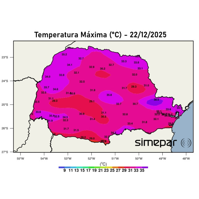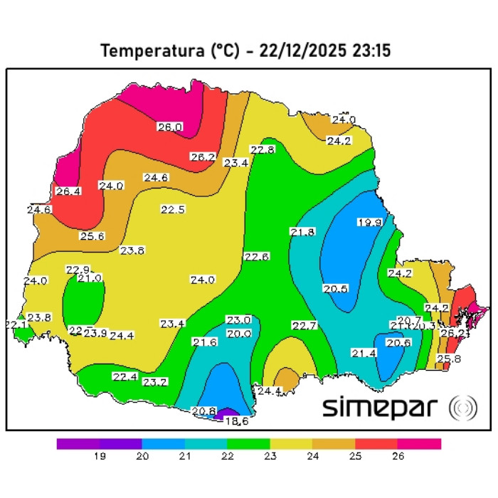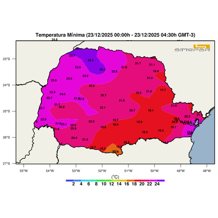 A madrugada desta terça-feira foi marcada por noite abafada em todo o Paraná. As temperaturas mínimas permaneceram elevadas, variando majoritariamente entre 18 °C e 24 °C, as menores mínimas ocorreram de forma pontual no extremo sul e áreas de maior altitude, com valores próximos de 17–18 °C, enquanto no norte, oeste e faixa leste, incluindo a Região Metropolitana de Curitiba, as mínimas ficaram acima de 20 °C.