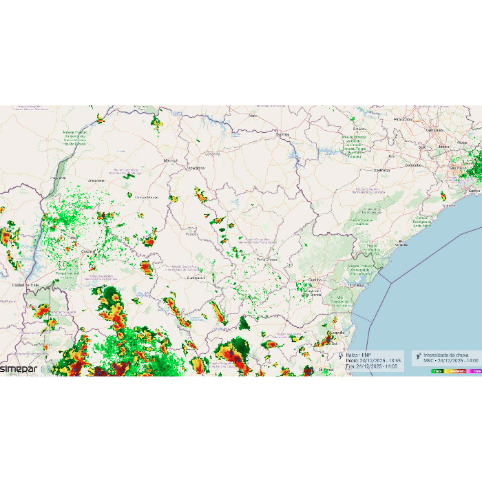 Tarde segue muito quente no Paraná. Em cidades do Litoral e do Noroeste as temperaturas já ultrapassaram os 34°C. Em vários pontos há também registro de chuvas, que atuam de forma bem irregular. Pelas informações dos radares meteorológicos identifica-se algumas tempestades próximo a divisa com o Mato Grosso do Sul e Campo Mourão, por exemplo.
