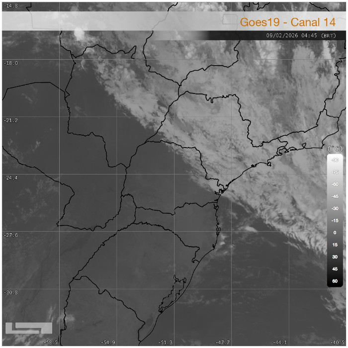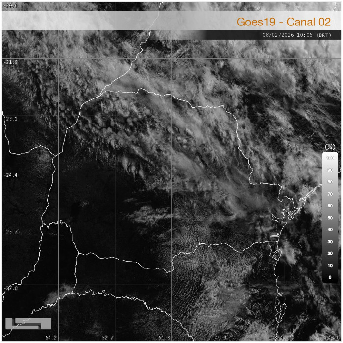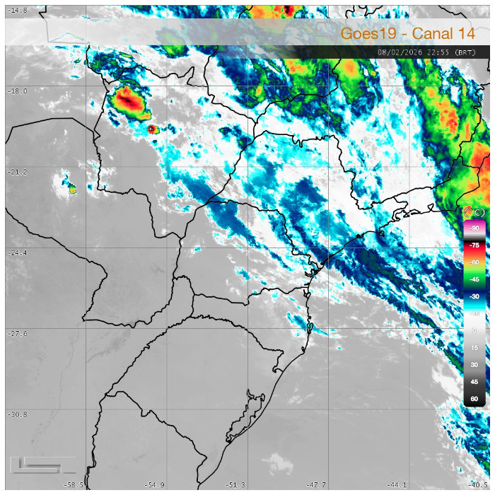 Durante a noite deste domingo, as instabilidades que atuaram ao longo da tarde e início da noite sobre o Paraná perderam força gradualmente. No momento, observa-se uma redução significativa das áreas de chuva, com predomínio de nebulosidade menos profunda e tempo mais estável na maior parte do estado. A imagem de satélite mostra que os núcleos mais intensos se afastaram ou enfraqueceram, restando principalmente áreas de nebulosidade associadas a nuvens médias e altas. Ainda assim, no Oeste do Paraná, há registro de áreas com chuva fraca a moderada, acompanhadas de raios. Dessa forma, o risco para temporais diminui consideravelmente neste horário, favorecendo um período de tempo mais calmo ao longo da madrugada. Devido à atmosfera quente e úmida, não se descarta a ocorrência pontual de chuva fraca e isolada, mas sem indicativo de fenômenos severos.