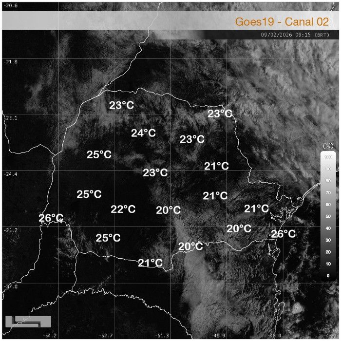 Manhã com muitas nuvens em boa parte do estado, com destaque para porções do Centro, Noroeste, Norte, Campos Gerais e Leste. Em alguns pontos do Centro-Leste e faixa norte houve registro de chuva fraca e ocasional no início da manhã, dando lugar gradualmente ao Sol. Campos Gerais e Norte Pioneiro ainda apresentam grande cobertura de nuvens, em função do ar bastante úmido. Quanto às temperaturas, os maiores valores vão sendo registrados no Oeste (na faixa dos 28 °C) e no litoral (ao redor dos 26/27 °C). Nos demais setores, os termômetros registram marcas acima dos 20 °C (excetuando Palmas, no distrito de Horizonte). Nas próximas horas as chuvas retornam ao estado de forma irregular com trovoadas.
