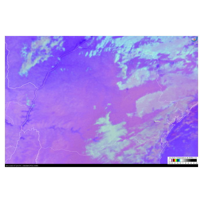 Através da imagem a seguir, extraída do satélite GOES-19, observa-se que, neste fim de noite, o céu no Leste do estado permanece encoberto por nuvens baixas (coloração azul-ciano), enquanto no Norte observa-se variação dessa mesma nebulosidade. Já no Sudoeste, Centro-Sul e áreas centrais, há presença de nuvens em altos níveis. Nas demais regiões, representadas pela coloração violeta, o céu está sem nebulosidade.