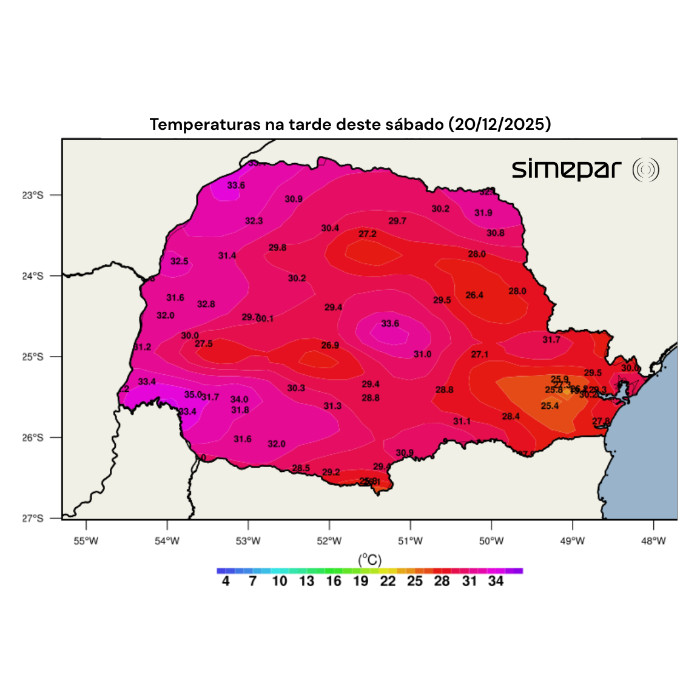 Nesta tarde, as temperaturas ultrapassaram os 25 °C em todos os termômetros distribuídos pelo território paranaense, com registros acima dos 30 °C em diversos municípios, conforme pode ser observado na imagem a seguir. Os maiores valores, até as 16h30, foram registrados em Capanema, com 35 °C, além de Loanda e Cândido de Abreu, ambos com 33,6 °C.
