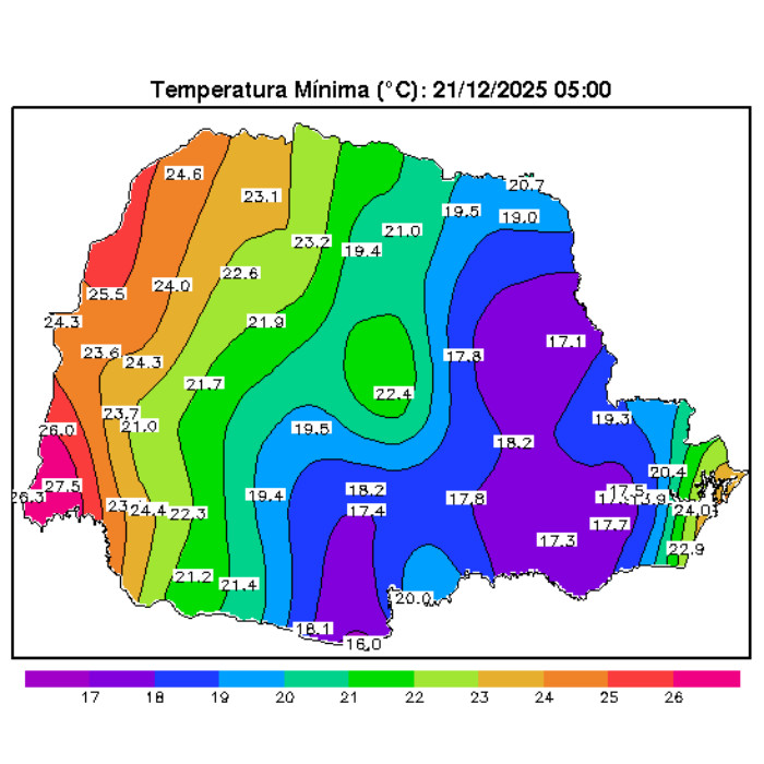 A madrugada foi marcada por baixa amplitude térmica em todo o estado, ou seja, as temperaturas pouco variaram ao longo do período. Em uma atmosfera mais aquecida, e com grande oferta de umidade, a sensação de abafamento foi marcante em alguns municípios, especialmente do oeste paranaense. Se destacam São Miguel do Iguaçu (26,4 °C), Foz do Iguaçu (25,2 °C), Altônia (25,2 °C) e Santa Helena (25 °C), com as temperaturas mínimas mais elevadas do dia. Cidades do Centro-Sul, Sudeste, Campos Gerais e RMC, anotaram nos termômetros valores mais amenos, ao redor dos 17 °C. No momento, áreas de instabilidade se deslocam do Paraguai em direção à região de Foz do Iguaçu, com possibilidade para pancadas de chuva com trovoadas nas próximas horas.