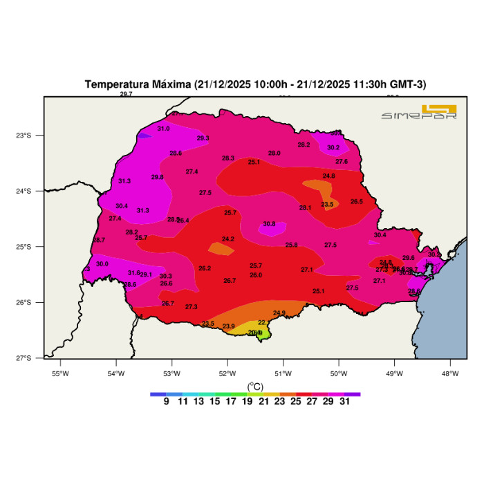 As condições atmosféricas deste domingo, que marca o início do verão, registram temperaturas elevadas somadas à umidade relativa do ar acima de 60%, intensificando a sensação de calor e abafamento em todo o Paraná. Desde o período da manhã, observa-se o predomínio de valores elevados de temperatura, variando entre 27 °C e 31 °C na maior parte do estado, caracterizando calor intenso típico da estação. As maiores temperaturas até o momento concentram-se nas regiões central e oeste, enquanto áreas ao sul e pontos isolados apresentam temperaturas ligeiramente mais amenas, próximas ou abaixo de 25 °C. Esse padrão atmosférico, aliado à elevada umidade, contribui para o desconforto térmico e aumenta a probabilidade de formação de nuvens e pancadas de chuva ao longo do dia.