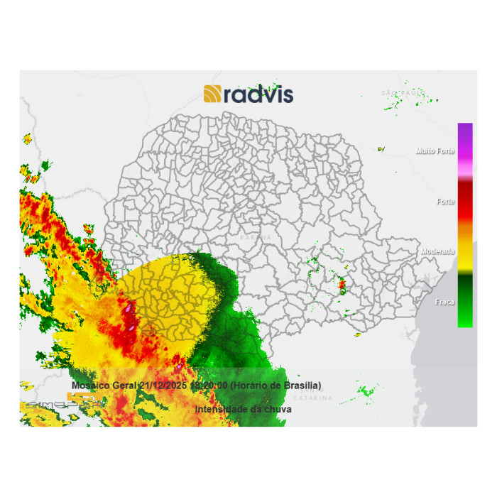Até as 18h30, a estação meteorológica do Simepar, instalada no próprio município, registrou acumulado de 38,4 mm de chuva, sendo que cerca de 25 mm ocorreram apenas entre as 17h e 18h. A imagem a seguir, extraída dos radares meteorológicos, exibe a situação atual.