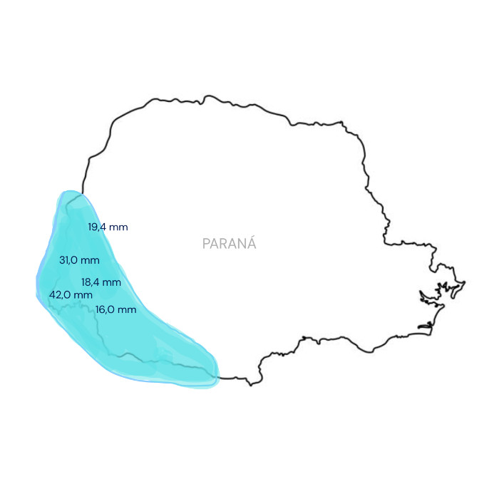 Ao longo deste domingo, a precipitação concentrou-se principalmente entre as regiões Oeste e Sudoeste do Paraná, onde foram registrados os maiores acumulados de chuva. Na imagem a seguir, a área delimitada em azul-ciano indica as regiões com registro de precipitação, bem como os valores numéricos nas localidades que superaram os 15 milímetros (mm) no decorrer do dia. Esses registros foram obtidos por estações meteorológicas do Simepar e do INMET, localizadas nos municípios de Foz do Iguaçu, Santa Helena, Marechal Cândido Rondon, São Miguel do Iguaçu e Planalto, listados em ordem decrescente de acumulado de chuva.