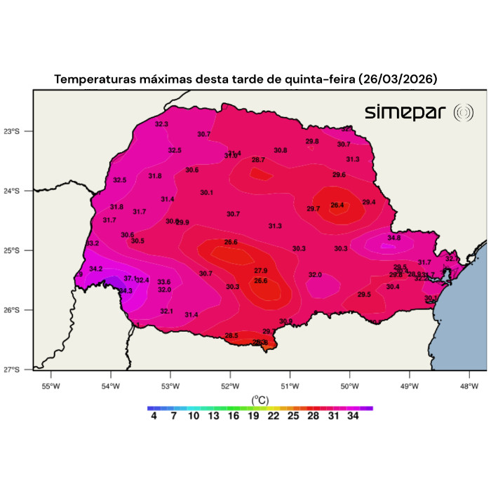 Na imagem a seguir, observa-se a distribuição das temperaturas máximas nesta tarde no Paraná.