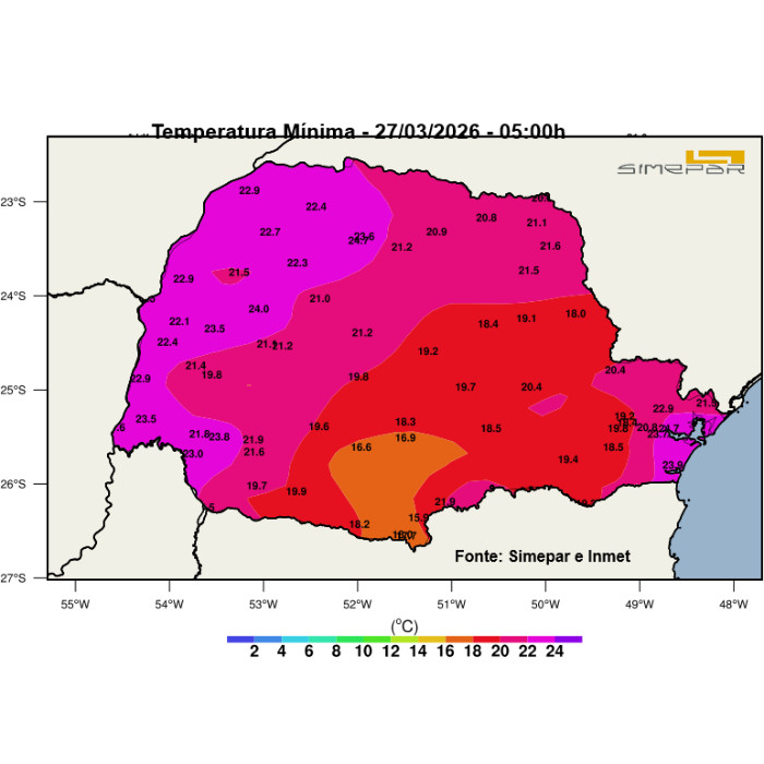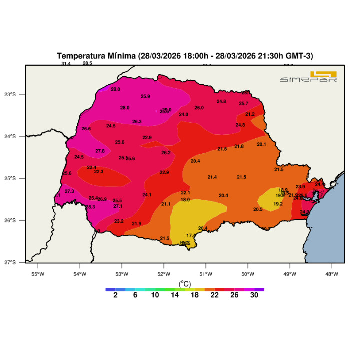 As temperaturas caem ao longo da noite em todo o estado, e a ausência de nuvens tem papel importante nesse processo. Com o céu mais aberto, o calor acumulado durante o dia se perde com mais facilidade para a atmosfera, favorecendo um resfriamento mais rápido. No mapa, observa-se que, mesmo assim, o oeste e o noroeste ainda concentram os valores mais elevados no início da noite, com temperaturas acima dos 25°C. Já nas regiões centrais e no leste, os valores ficam mais amenos, variando entre 19°C e 25°C.