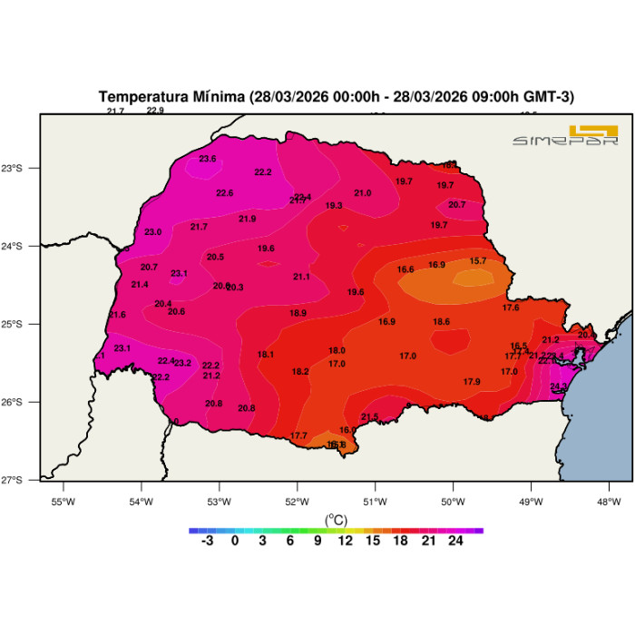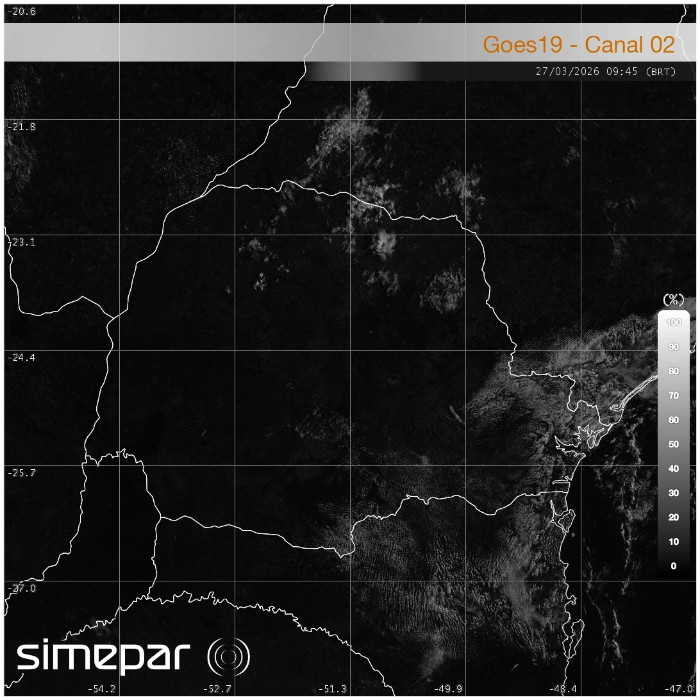 O sábado começa com Sol em todas as regiões paranaenses, o que favorece rápida elevação das temperaturas. Em alguns pontos, especialmente do Centro-Leste do Paraná, nuvens baixas e nevoeiros foram registrados neste amanhecer, agora entrando em dissipação. Quanto às temperaturas, os menores valores foram registrados do Centro-Sul aos Campos Gerais e RMC, com até 15,7 °C em Jaguariaíva e 16,5 °C em Colombo. Nos médios níveis da atmosfera, a presença de uma crista meteorológica dificulta o desenvolvimento de chuvas sobre o estado neste sábado, com ocorrências muito localizadas em função do forte aquecimento.