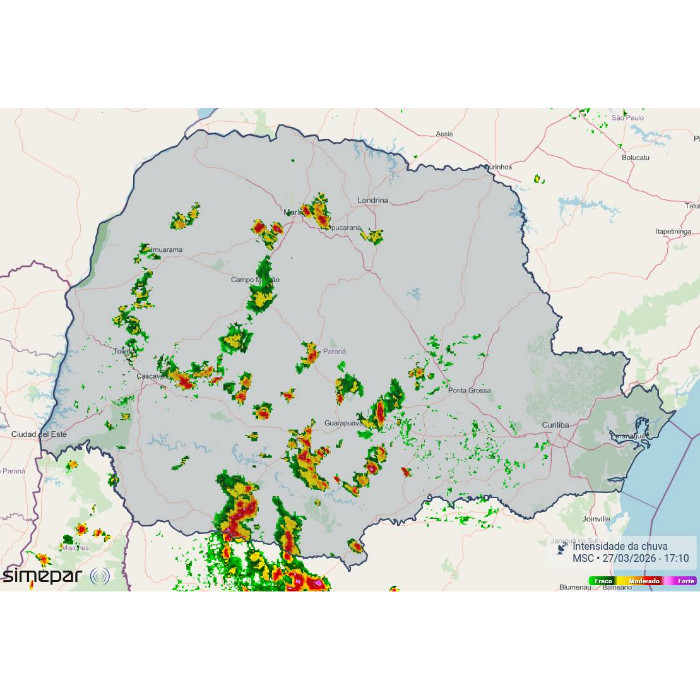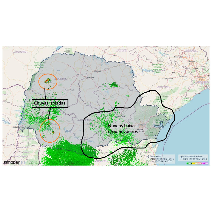 Sistemas de monitoramento seguem registrando chuvas em pontos do Noroeste, Oeste e Sudoeste do Paraná. Não há atividade elétrica (raios) acompanhando as instabilidades. No Centro-Sul, Campos Gerais e na RMC há presença de nuvens baixas e/ou nevoeiros. Nestes setores as temperaturas estão ligeiramente abaixo dos 20°C.