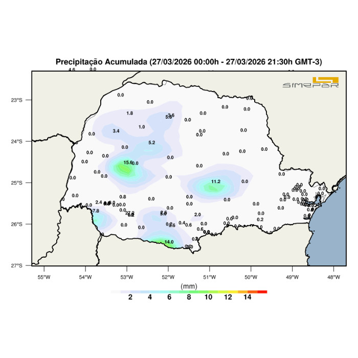 Os acumulados de precipitação sobre o estado nesta sexta-feira apresentaram distribuição irregular, típica de cenário convectivo isolado. Observa-se predomínio de baixos volumes na maior parte do território, com registros nulos ou inferiores a 2 mm em amplas áreas. Entretanto, núcleos mais relevantes se destacaram pontualmente no interior, com acumulados entre 10 e 16 mm, indicando a atuação de células convectivas mais organizadas, ainda que de curta duração.