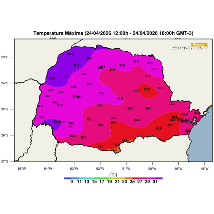 Tarde de calor e predomínio de Sol sobre todas as regiões paranaenses. Nebulosidade variável é registrada na divisa com o estado de Santa Catarina em função das chuvas que afetam o estado vizinho e também o Rio Grande do Sul, mas sem registro de chuva sobre o Paraná. Norte Pioneiro, Norte Central e Campos Gerais também apresentam nebulosidade, com nuvens do tipo "cumulus" - nesse caso, as "cumulus" de bom tempo. Temperaturas altas na faixa oeste e noroeste, com até 32,8 °C em Capanema, 32,6 ° em Loanda e 32,3 °C em Altônia. No Sudoeste, Centro, Norte Pioneiro e Campos Gerais, valores entre 27 °C e 30 °C. No Sul e RMC, as máximas não chegaram aos 27 °C, enquanto no litoral, os termômetros anotam marcas na casa dos 28 °C. Até o final da noite, chuvas isoladas não estão descartadas nas regiões de fronteira e divisa com Santa Catarina, no Oeste e Sudoeste.