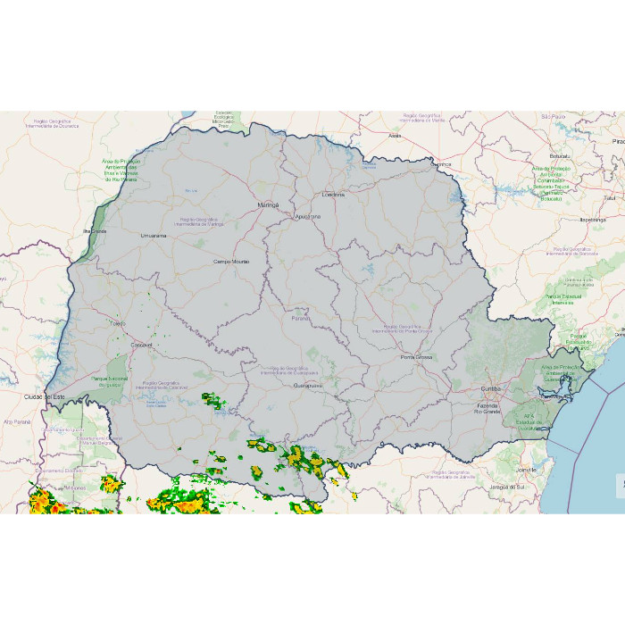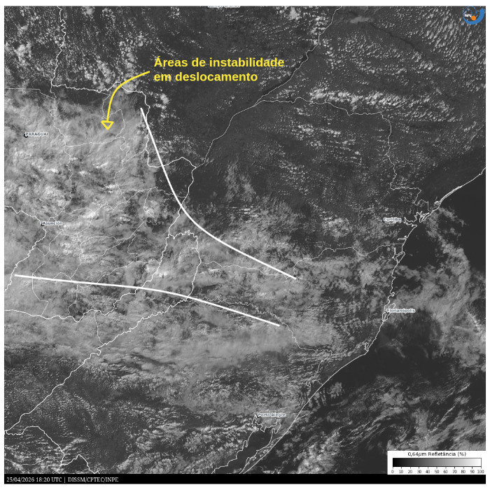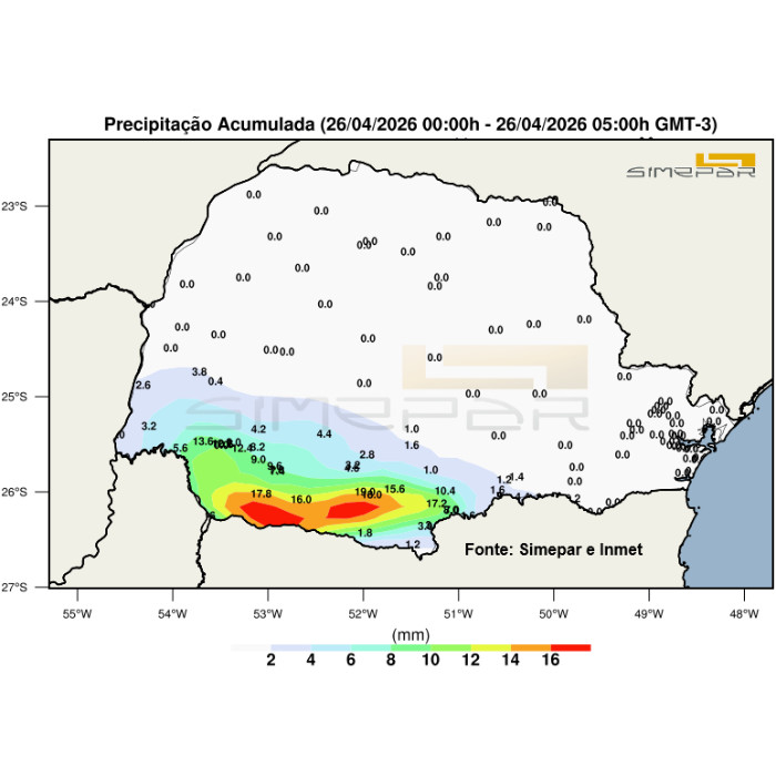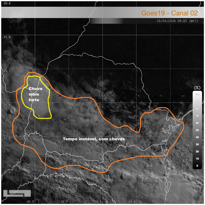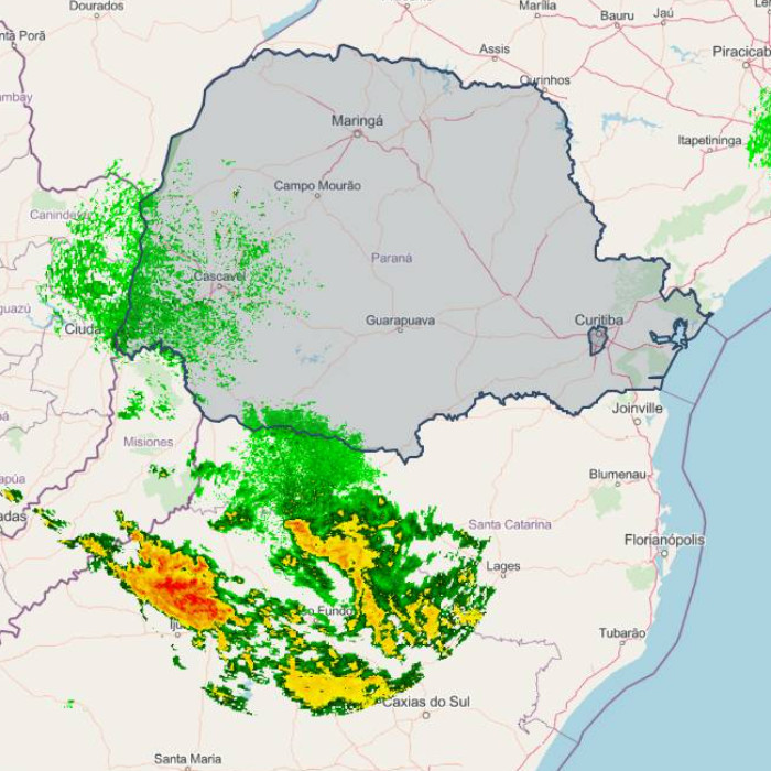 Na faixa de divisa com o estado de Santa Catarina, a nebulosidade dificulta maior elevação das temperaturas, onde as máximas até o momento não ultrapassaram a marca dos 21,4 °C em Palmas e dos 20,2 °C em General Carneiro. Pancadas de chuva são registradas no extremo sul, com trovoadas ocasionais. As instabilidades retornam gradualmente sobre a metade sul do Paraná ao longo deste sábado, com o avanço de um cavado meteorológico entre os 3 estados do Sul. O escoamento de umidade sobre a região e a formação de uma área de baixa pressão sobre os países vizinhos favorecem a formação de áreas de instabilidade no Paraguai e nordeste da Argentina. Nas próximas horas há risco para pancadas de chuva com trovoadas na faixa oeste e sudoeste.