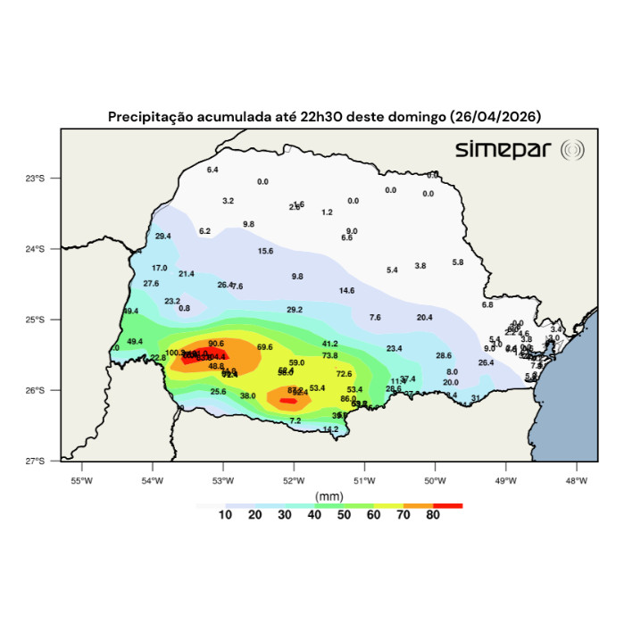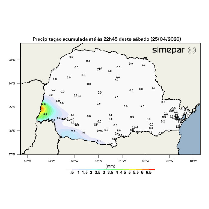 O dia foi marcado por ocorrência de chuva em grande parte do Paraná, com destaque para as regiões Sudoeste e Centro-Sul. Conforme pode ser observado na imagem a seguir, os acumulados de precipitação registrados até as 22h30 ultrapassaram 50 mm, com valores ligeiramente acima de 100 mm em Capanema e Cruzeiro do Iguaçu.
