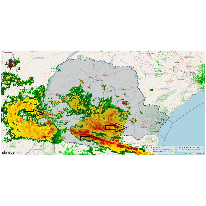 A partir da tarde deste sábado, a cobertura de nuvens aumentou gradualmente entre as regiões Oeste, Sudoeste e Centro-Sul, inclusive com registro de precipitação. Durante a noite, essa nebulosidade avançou em direção ao Sudeste e a áreas do Noroeste paranaense. No entanto, a ocorrência de chuva permaneceu concentrada entre o Oeste, Sudoeste e Centro-Sul.