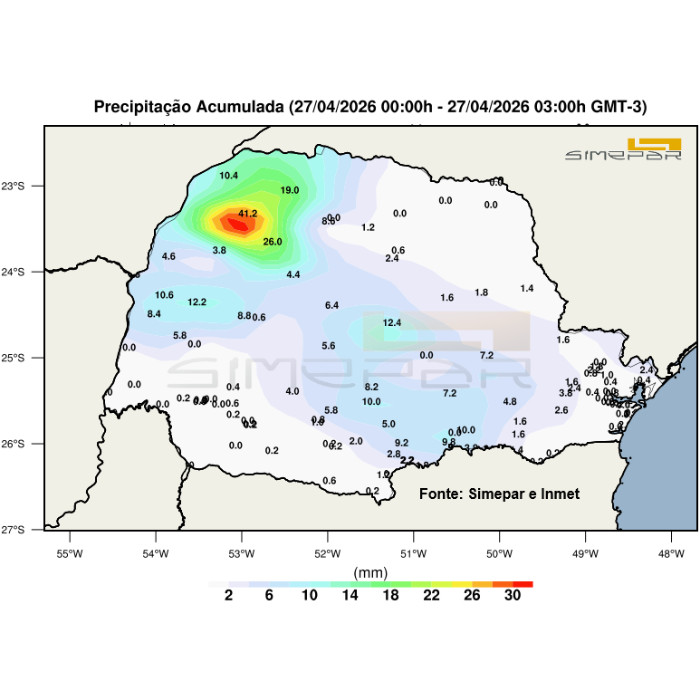 O eixo da frente fria avança pelo estado nesta madrugada de segunda-feira, provocando pancadas de chuvas, em algumas localidades acompanhadas de trovoadas. Neste momento, as chuvas mais significativas ocorrem no Noroeste/Norte, onde os acumulados já chegam aos 41 mm no município de Cidade Gaúcha. O mapa mostra os acumulados desde a 0h até às 3h, registrados pelas redes de estações meteorológicas do Simepar e Inmet.