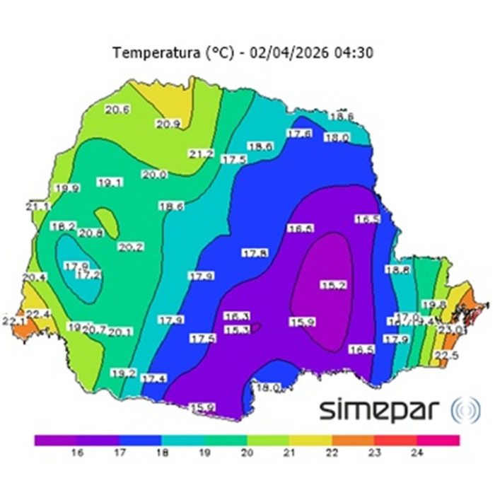 Nas últimas horas parou de chover no Paraná, embora o início da madrugada ainda fosse de tempo mais instável. Agora, segue com bastante nebulosidade na faixa norte do estado e também entre a Serra do Mar e o Litoral, mas nas demais regiões predomínio de céu parcialmente nublado. O destaque de hoje vai para a temperatura, que amenizou de forma mais expressiva entre os municípios do Centro-Sul e dos Campos Gerais, com valores em torno dos 15°C nesse momento. Atenção aos motoristas: nevoeiros em trechos das BRs 277, 376 e 116.