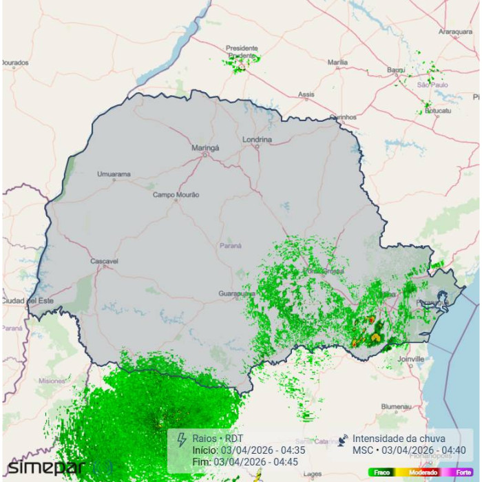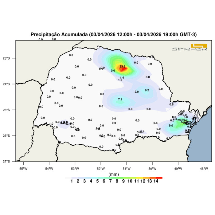 Ao longo da tarde, os acumulados de precipitação no estado apresentaram distribuição bastante irregular, caracterizando um padrão típico de pancadas convectivas desorganizadas. O principal destaque foi registrado em Londrina, com acumulado de 23,6 mm, evidenciando a atuação localizada de núcleos mais intensos. Em outras áreas, os volumes foram significativamente menores e mal distribuídos. Neste momento, segue em atuação áreas de chuva sobre o litoral, mantendo intensidade forte e acompanhadas por elevada incidência de descargas elétricas.