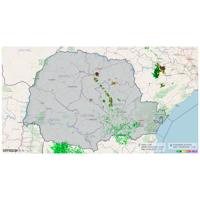 Início de tarde com mais calor entre o Oeste, Noroeste e no Litoral do estado, setores onde as temperaturas já estão acima dos 30°C. Algumas instabilidades ocorrem entre o Norte e a região Central paranaense, conforme indicado na imagem dos radares meteorológicos. São chuvas bem isoladas, que não cobrem grandes áreas.