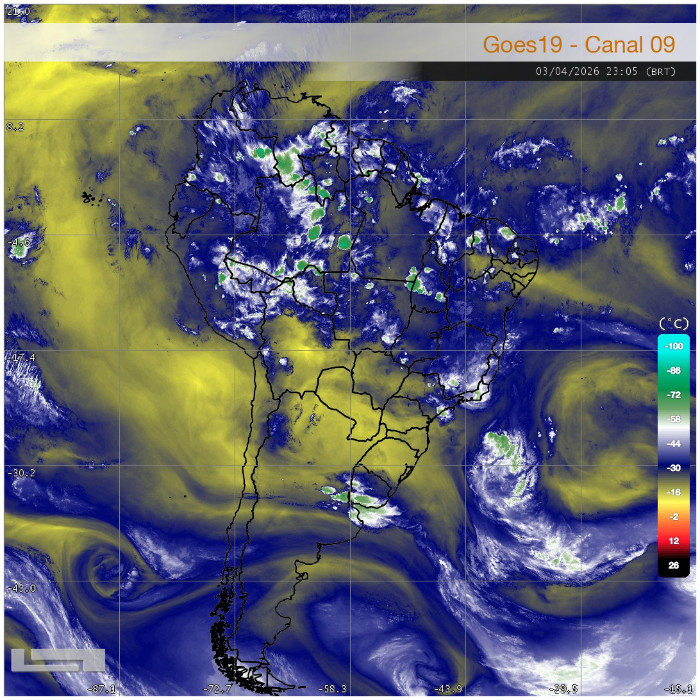 A imagem de satélite do canal de vapor d’água indica a presença de uma massa de ar mais seco atuando sobre o Sul do Brasil, incluindo o Paraná. Essa condição é evidenciada pelas tonalidades mais escuras predominando sobre o estado, o que representa menor conteúdo de umidade nos níveis médios e altos da atmosfera. Por outro lado, áreas com maior desenvolvimento de nuvens e maior disponibilidade de umidade se concentram mais ao norte do país e também sobre o oceano, afastadas do Paraná neste momento. Esse cenário favorece a estabilidade atmosférica, inibindo a formação de nuvens mais profundas e contribuindo para o predomínio de tempo firme na maior parte do estado.