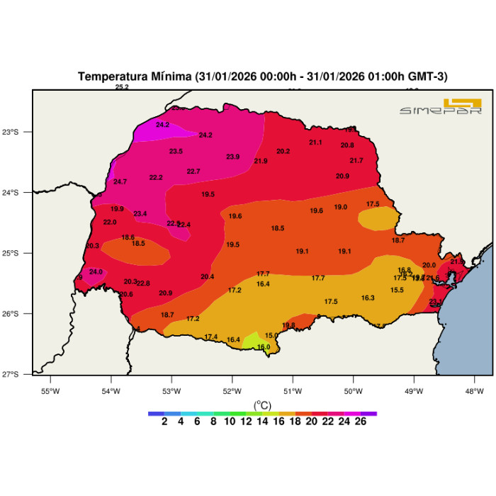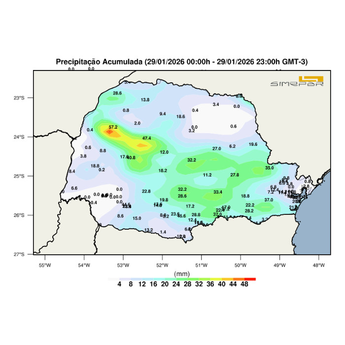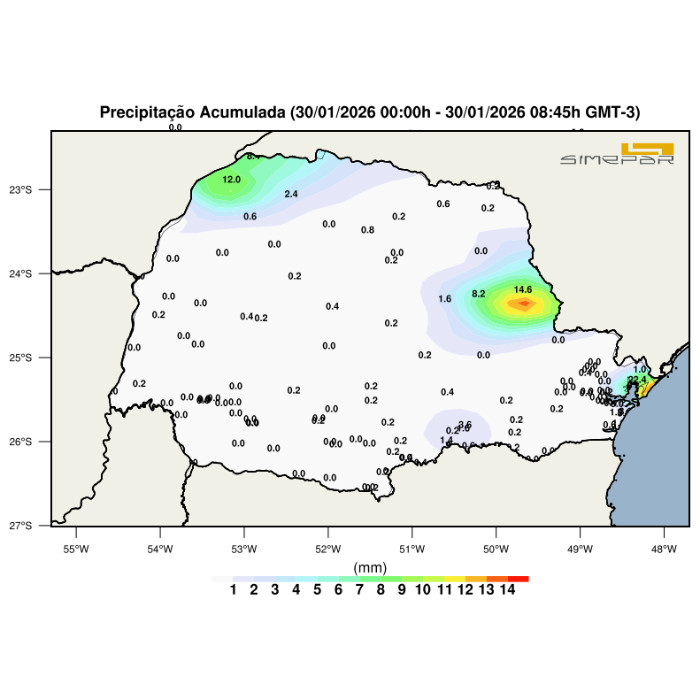 Durante o início da madrugada, foram observados eventos de precipitação, resultando em acumulados de 12,0 mm em Loanda, 8,4 mm em Diamante do Norte, 14,6 mm em Jaguariaíva, 8,2 mm em Ventania e 22,4 mm em Guaraqueçaba. Os eventos cessaram antes das 03h, predominando então a estabilidade no estado, condição que se mantém até o momento. Entretanto, ao final da manhã e início da tarde, espera-se o retorno das instabilidades.