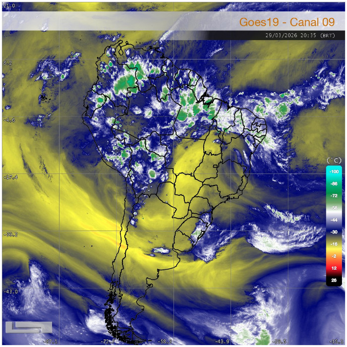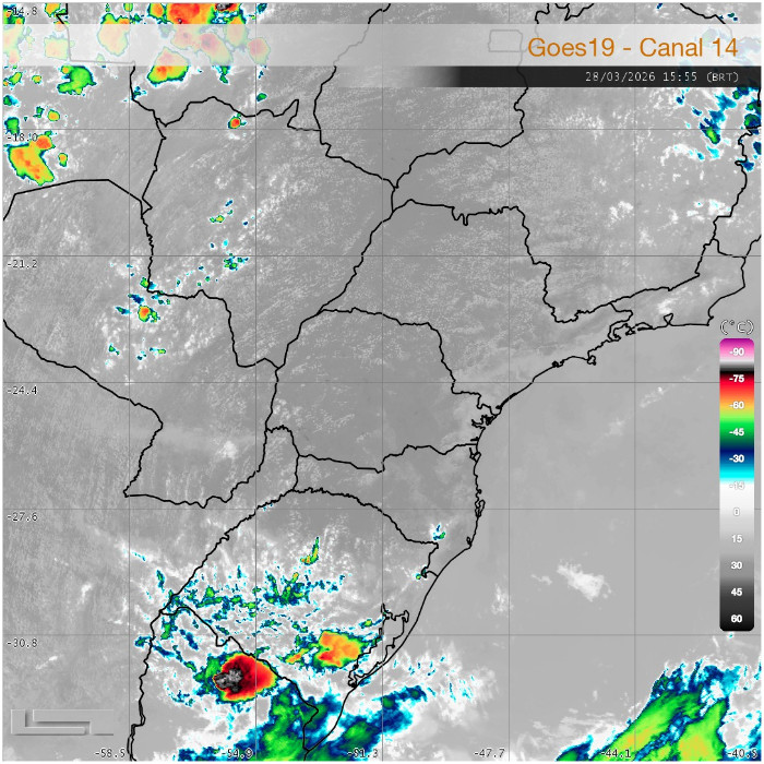 O deslocamento de um cavado meteorológico em altitude (o qual favorece a formação de nuvens de chuva) próximo ao litoral do Sul do Brasil aumenta a cobertura de nuvens com pancadas de chuva e trovoadas sobre o oceano. No Sudeste e na faixa leste do Paraná há um aumento da nebulosidade média e alta, em conjunto com as nuvens baixas que entram em dissipação. Nas próximas horas, será observado o retorno das instabilidades sobe o Centro-Sul, Sudeste, RMC, litoral e Campos Gerais em função desse sistema. Quantos às temperaturas, seguem em rápida elevação no interior, onde o Sol predomina, enquanto no Leste, em função da cobertura de nuvens, a elevação é mais lenta.