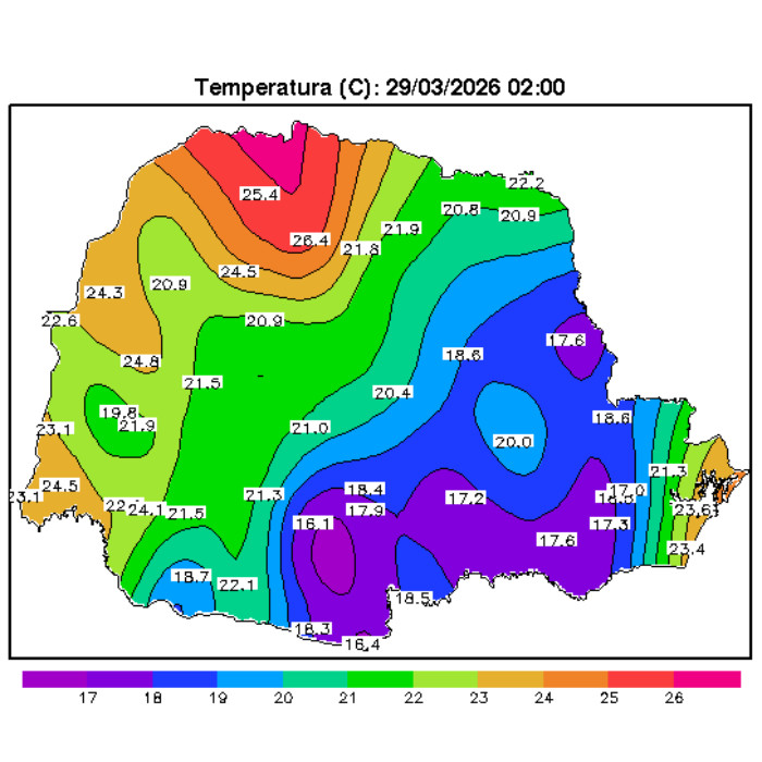 As temperaturas caem ao longo da noite em todo o estado, e a ausência de nuvens tem papel importante nesse processo. Com o céu mais aberto, o calor acumulado durante o dia se perde com mais facilidade para a atmosfera, favorecendo um resfriamento mais rápido. No mapa, observa-se que, mesmo assim, o oeste e o noroeste ainda concentram os valores mais elevados no início da noite, com temperaturas acima dos 25°C. Já nas regiões centrais e no leste, os valores ficam mais amenos, variando entre 19°C e 25°C.