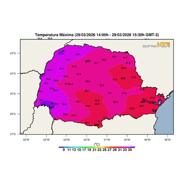 Com o Sol atuando em todas as regiões paranaenses desde o início da manhã, as temperaturas apresentaram forte elevação, com valores ao redor dos 30 °C em todos os setores. No Oeste, Sudoeste e Noroeste, os termômetros registram marcas ao redor dos 35 °C, como é o caso de Umuarama (34,2 °C), Planalto (34,3 °C), São Miguel do Iguaçu (34,7 °C), Cruzeiro do Iguaçu (34,9 °C), Loanda (35,7 °C) e Capanema (38,1 °C). Chuvas muito localizadas e passageiras com trovoadas foram registradas por volta das 15h no extremo oeste do estado em função do calor intenso e proximidade com o Rio Paraná, enquanto nas demais regiões há apenas variação de nuvens.