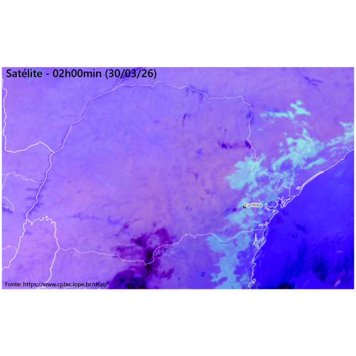 Madrugada de tempo estável, sem chuvas, no Paraná. Presença de algumas nuvens baixas e/ou nevoeiros no Sul, parte dos Campos Gerais e RMC. Demais setores presença de pouca nebulosidade. Temperaturas bastante variadas no estado neste momento. Menores valores no Centro-Sul, perto de 16°C, enquanto no Noroeste ainda está bem quente (acima de 25°C em algumas cidades).