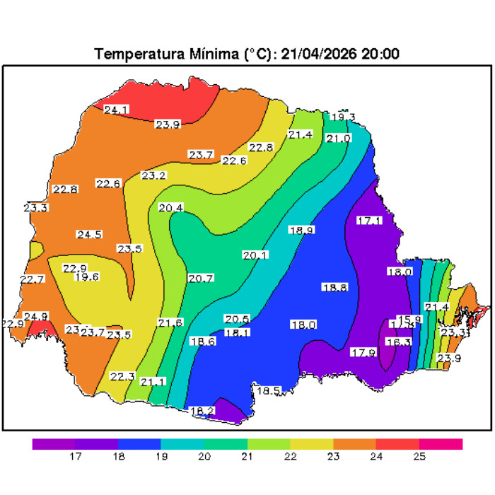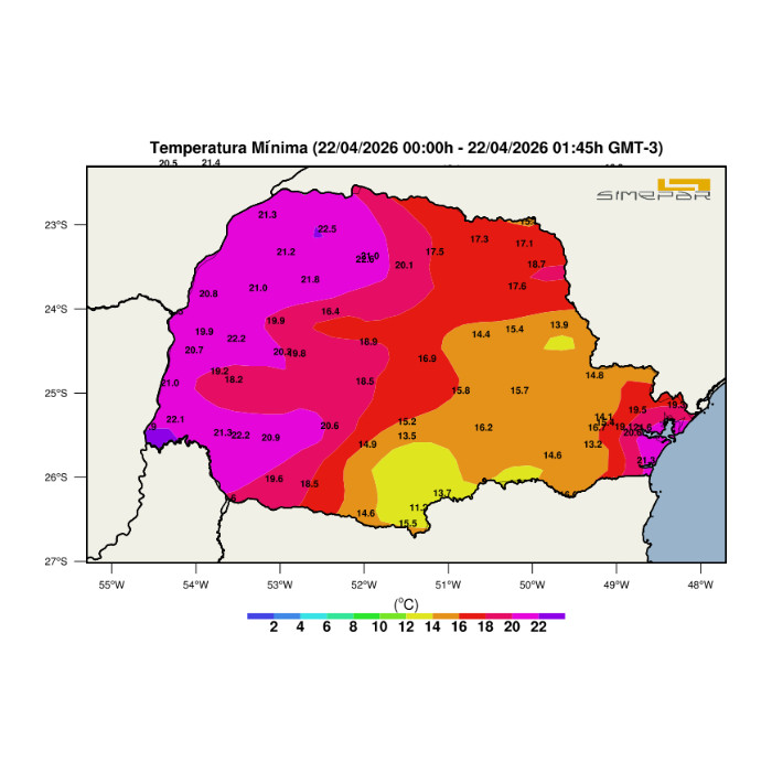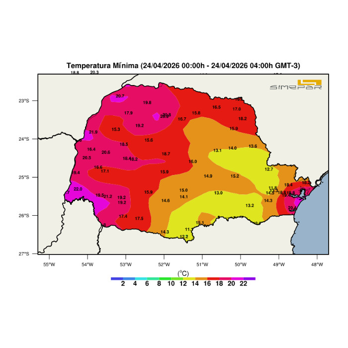 Nesta madrugada, as temperaturas mínimas registradas indicam um padrão de temperaturas elevadas em boa parte do Paraná. De forma geral, os valores permanecem acima dos 15°C na maior parte do estado, com destaque para as regiões Oeste, Noroeste e Norte, onde as mínimas ficaram entre 18°C e 22°C em diversas localidades. Nas regiões Centro-Sul, Campos Gerais e parte da faixa Leste, os valores são um pouco mais amenos, variando entre 12°C e 15°C, especialmente em áreas de maior altitude. Já no Litoral e na Região Metropolitana de Curitiba, as temperaturas também se mantêm relativamente elevadas, próximas dos 18°C a 20°C.