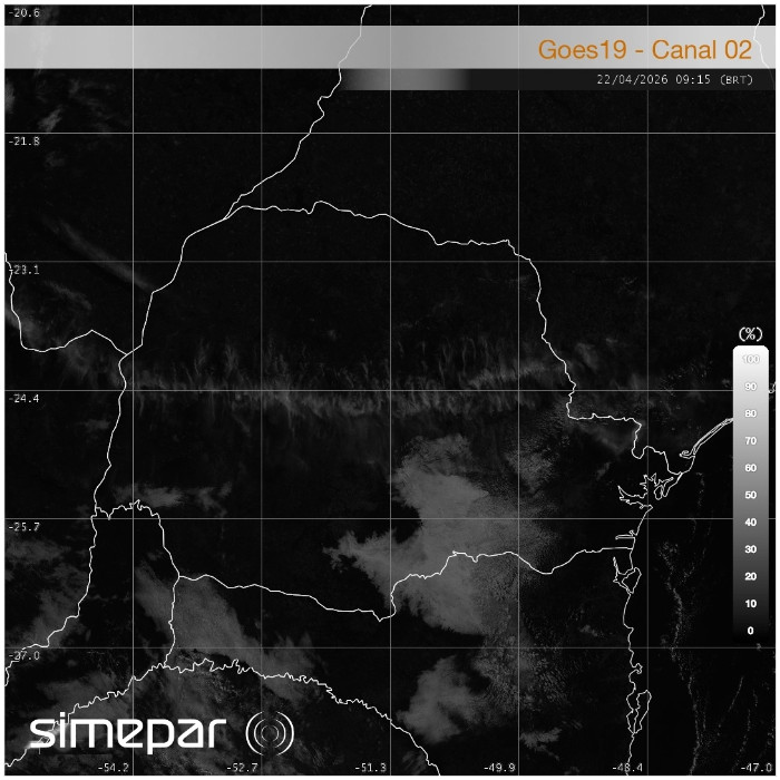 Neste momento, a imagem de satélite do canal infravermelho evidencia condições de tempo estável sobre o Paraná. Não há registro de chuva no estado, e a nebulosidade presente ocorre de forma variável e pouco organizada, sem favorecer o desenvolvimento de instabilidades. Esse padrão reflete uma atmosfera mais estável, que mantém o tempo firme na maior parte das regiões.