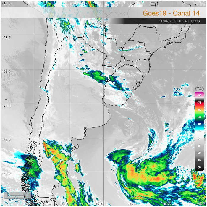 Mais uma noite com ausência de nuvens na maior parte das regiões do Paraná. No Leste do estado, a coloração azul-ciano indica o aumento da nebulosidade baixa, causada pelo escoamento marítimo que avança sobre o continente; ao transpor a Serra do Mar, o ar resfria e se condensa, favorecendo a formação desse tipo de nebulosidade. Já em algumas localidades do Sudoeste e Centro-Sul, há variação de nuvens em níveis médios e altos, transportadas pelo escoamento em níveis mais elevados da atmosfera, não descartando a ocorrência de pancadas de chuva isoladas e de fraca intensidade.