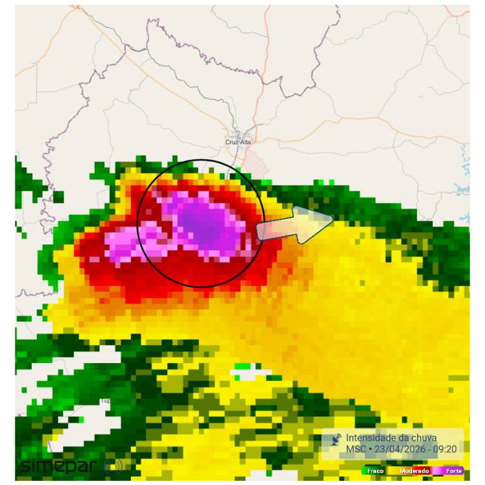Em contraste, no Rio Grande do Sul o destaque são as chuvas e as tempestades, que voltam a afetar o estado nesta quinta-feira. Tempestades severas afetam a região do Planalto Médio, com densa atividade de raios, chuva intensa e potencial para queda de granizo acompanhada de rajadas de vento. Chove com menor intensidade na Campanha, Centro e Serra do Sudeste. A imagem de radar em anexo, mostra a tempestade em deslocamento ao sul do município de Cruz Alta, seguindo na direção leste/nordeste.