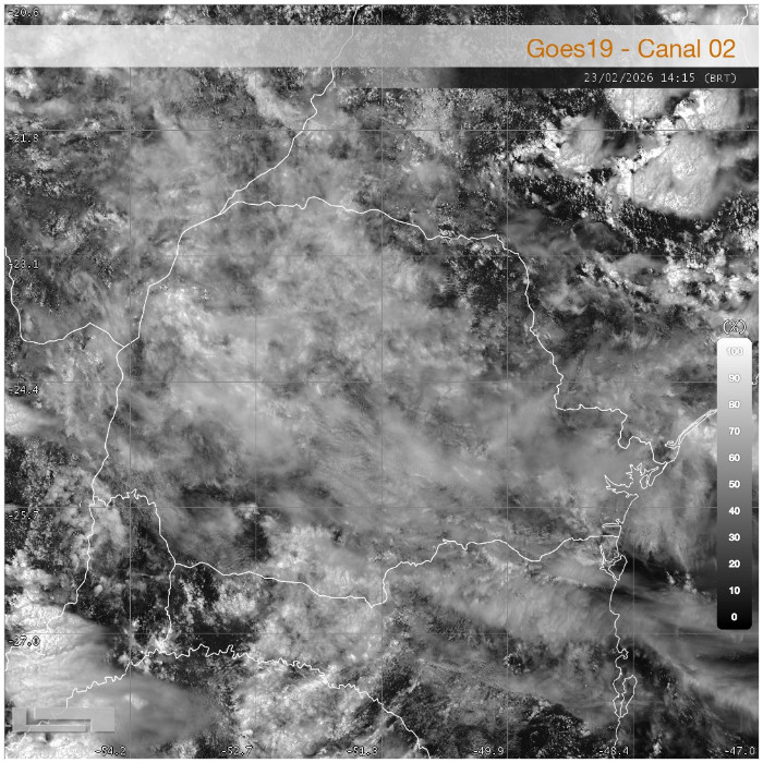A tarde desta segunda-feira começa com céu encoberto em todo o território paranaense. Há grande disponibilidade de umidade sobre o país e, associada às altas temperaturas, essa condição favorece a manutenção da nebulosidade sobre o estado. Esse cenário é resultado da combinação do aquecimento diurno com o transporte de umidade em baixos níveis, criando um ambiente atmosférico mais instável. Na imagem de satélite no canal visível, observa-se uma extensa área de nuvens com aspecto mais homogêneo e estratiforme, indicando predomínio de nebulosidade com menor desenvolvimento vertical. Com isso, a chuva tende a ocorrer de forma mais persistente em alguns setores, principalmente nas regiões Oeste, Sudoeste e Noroeste, onde o ar mais aquecido pode favorecer episódios de chuva moderada. Já no Leste e no Litoral, a nebulosidade mantém as temperaturas mais amenas, com possibilidade de chuva fraca ao longo do período.