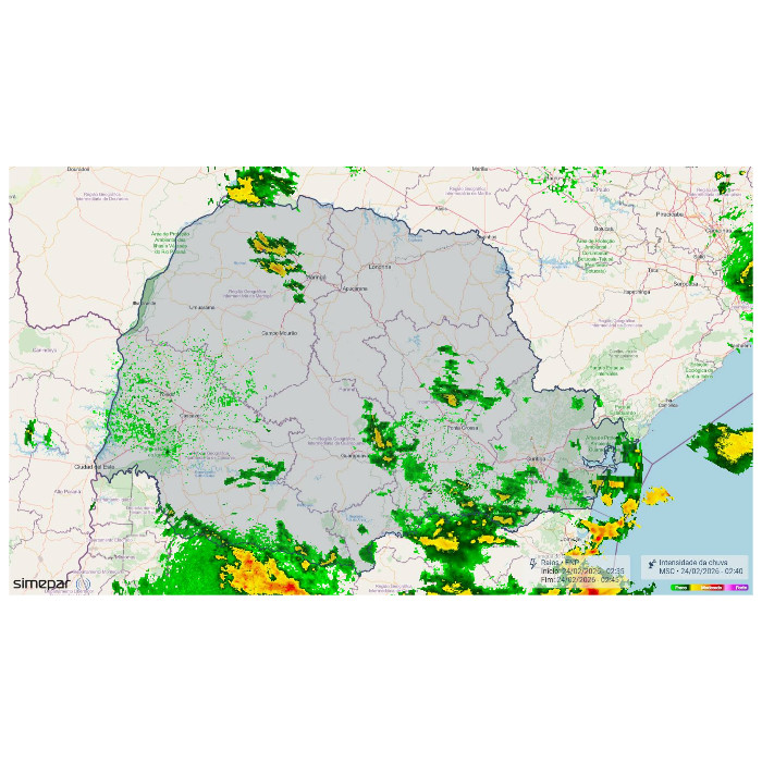 Madrugada de tempo instável especialmente entre o Noroeste e o Norte do Paraná. Chove em vários municípios, com registro de algumas descargas atmosféricas. Em Londrina e Cornélio Procópio choveu perto de 15 mm nas últimas horas. Nos Campos Gerais e no Leste há também registro de algumas precipitações (próximo a Irati e Guaraqueçaba, por exemplo). No Sul paranaense as temperaturas estão mais amenas no momento, com valores perto dos 16°C.