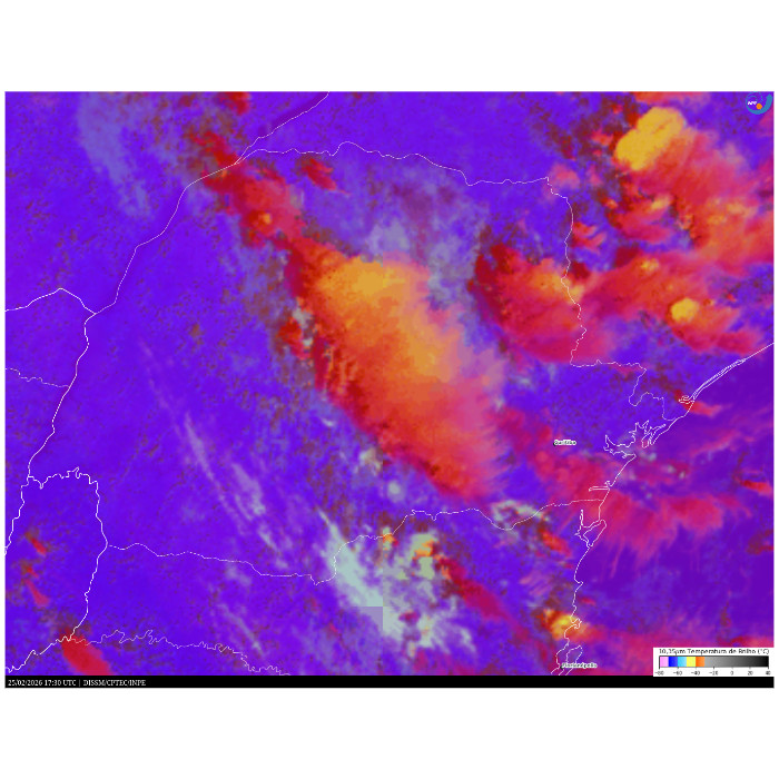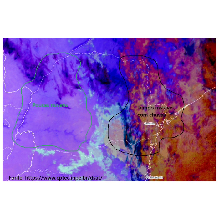 O deslocamento de uma frente fria sobre o oceano, combinado com uma área alongada de baixa pressão em altitude, deixam o tempo instável em boa parte do Paraná. Há ocorrência de pancadas de chuva e temporais especialmente nos Campos Gerais, Noroeste e Norte Pioneiro. Na faixa central e sul, as instabilidades atuam com menor intensidade, mas ainda acompanhada de alguns raios. No Leste (RMC/litoral), as chuvas aumentam na próxima hora com possibilidade para trovoadas e rajadas de vento pontuais. Em contrapartida, no Oeste, Sudoeste e parte do Noroeste, o Sol predomina entre algumas nuvens, com temperaturas acima dos 30 °C. Na imagem de satélite a seguir, as instabilidades podem ser visualizadas nas áreas com cores quentes.