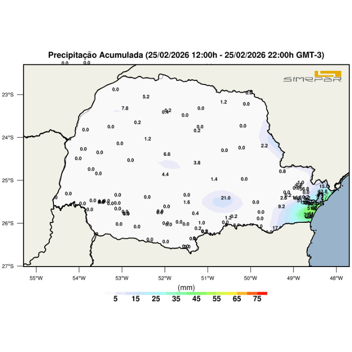 Apesar do predomínio de nebulosidade ao longo do dia em diversas regiões do Paraná, os acumulados de precipitação permaneceram baixos na maior parte do estado. Os registros indicam volumes pouco expressivos e mal distribuídos, com ocorrência de chuvas fracas e isoladas. Pontualmente, foram observados acumulados ligeiramente mais elevados no setor norte e em áreas do litoral, porém sem volumes significativos. De modo geral, o cenário foi marcado por céu encoberto em vários momentos, mas com precipitação limitada e de baixa intensidade.
