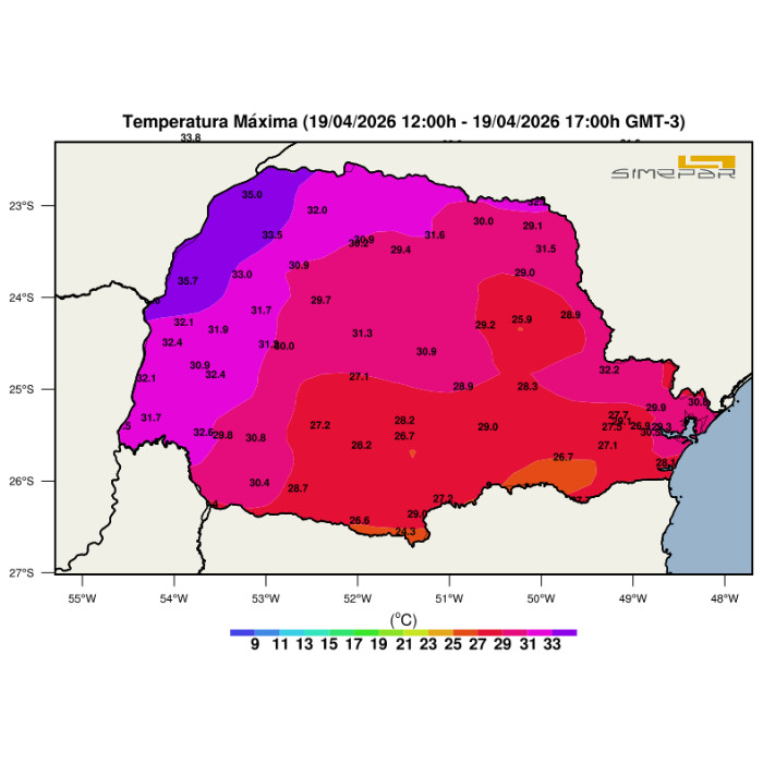 A tarde deste domingo foi marcada por elevação das temperaturas em todas as regiões paranaenses. O destaque vai para a região Noroeste, com máximas ao redor dos 35 °C, como Loanda (35 °C) e Altônia (35,7 °C). Entre o Centro-Sul, Sudeste, Campos Gerais e RMC, os valores ficaram na faixa dos 25-30 °C, exceto General Carneiro (Simepar), que registrou temperatura máxima de 24,3 °C. No Sudoeste, Oeste e faixa norte, o aquecimento também foi pronunciado, com marcas acima dos 30 °C. Esse cenário é resultado da atuação de uma massa de ar mais seco, trazendo predomínio de Sol com pouca ou nenhuma nebulosidade - efeito que colabora para forte aquecimento no período diurno e resfriamento durante a noite.