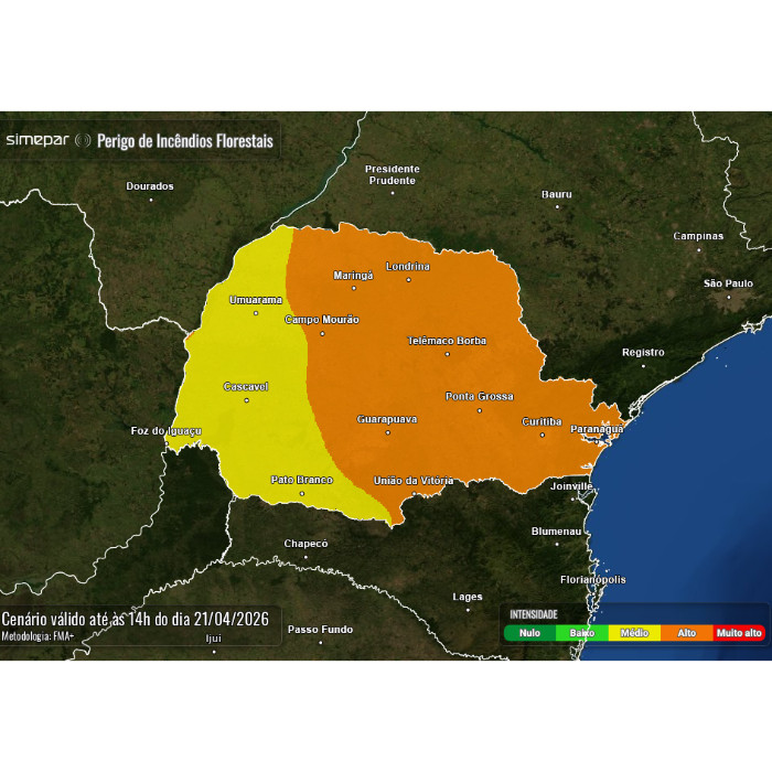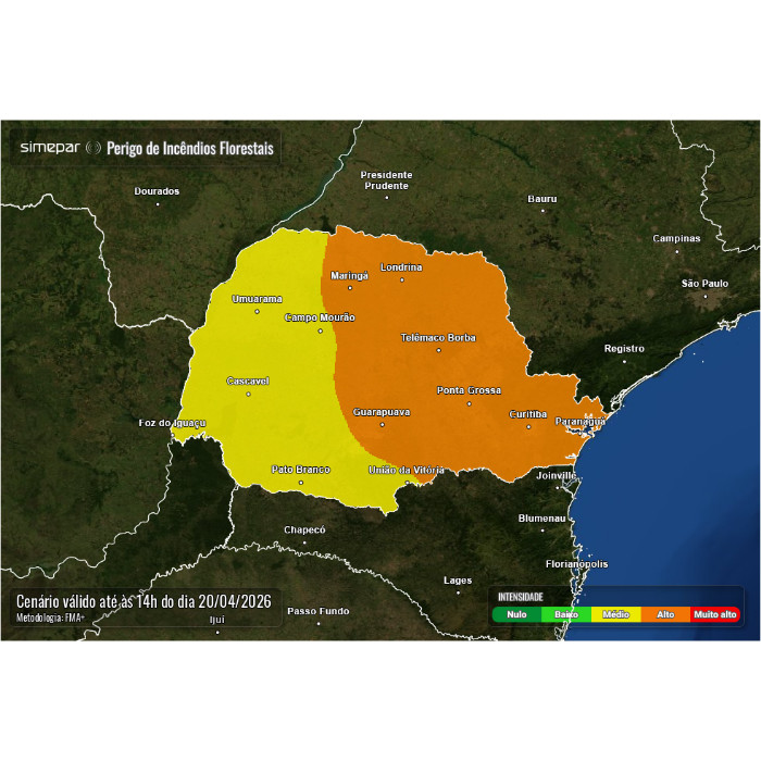 A chuva mais irregular e escassa no Centro-Leste do Paraná nas últimas semanas eleva o risco para incêndios florestais. Veja nos mapas a seguir, a distribuição espacial das temperaturas máximas registradas neste domingo e as áreas com risco para incêndios florestais no Paraná, com validade até às 14h desta segunda-feira.