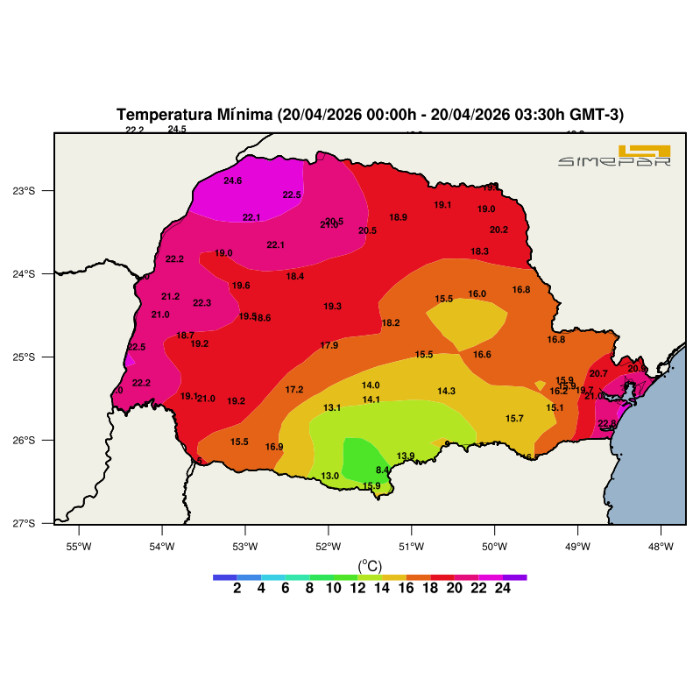 Nesta madrugada, as temperaturas mínimas no Paraná evidenciam valores mais elevados na faixa o oeste do estado, onde os registros se mantêm, em geral, acima dos 22 °C. Em direção às regiões centrais, observa-se um gradiente de diminuição, com temperaturas entre 18 °C e 21 °C. Já no sul do estado, especialmente no setor centro-sul, concentram-se os menores valores, variando entre 8 °C e 16 °C. O litoral registra mínimas mais elevadas, próximas ou superiores a 22 °C, sob influência da umidade e da proximidade com o oceano.