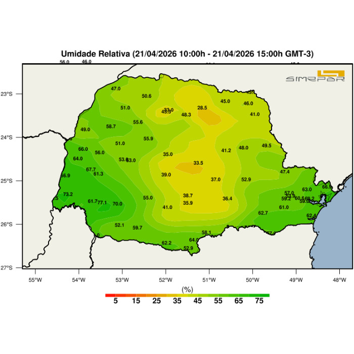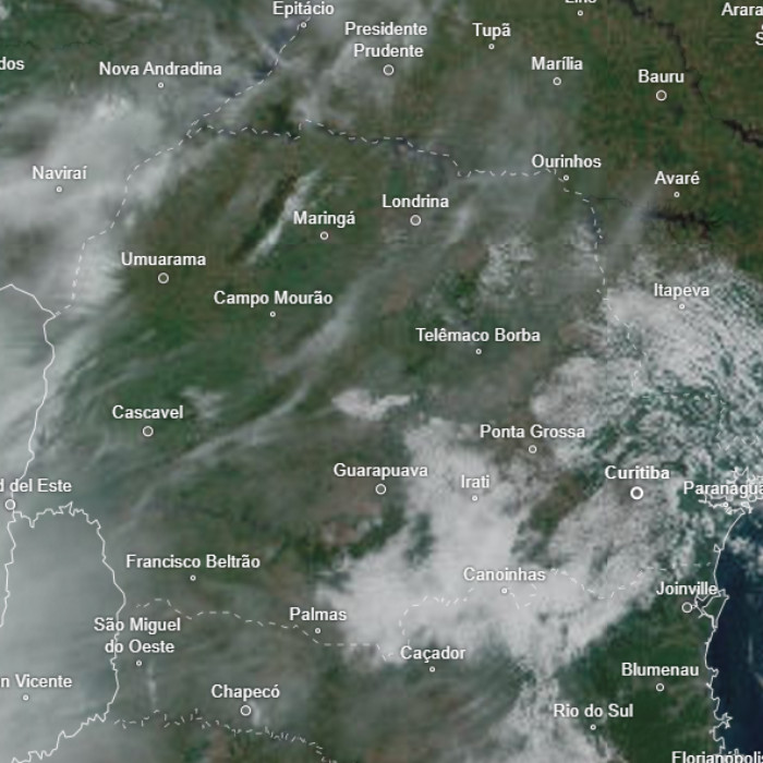 Em contraste a esse cenário de abafamento e instabilidades, as regiões de Londrina (Norte), Cândido de Abreu (Centro) e Guarapuava (Centro-Sul) apresentam baixa umidade relativa do ar, com valores abaixo dos 40%, indicando a presença de um ar mais seco. Na imagem de satélite (canal visível) em anexo, é possível observar a ausência ou baixa presença de nuvens nessas regiões. Esse ar mais seco se estende também ao Norte Pioneiro, com valores ligeiramente acima dos 40%. Nos Campos Gerais, Sul e Leste, com maior conteúdo de umidade, favorecido pela circulação marítima, o predomínio é de tempo estável e Sol.