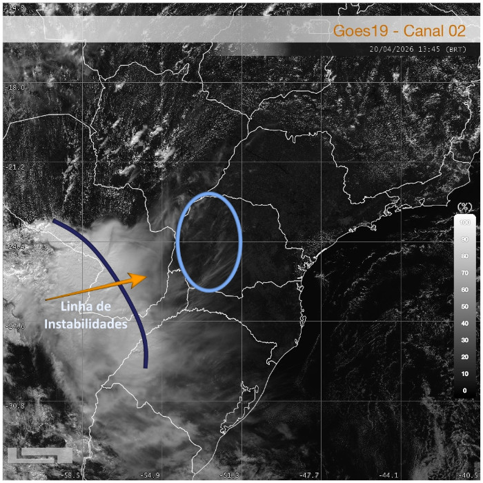 Nos médios níveis da atmosfera (por volta de 5km de altitude), o padrão de ondas indica o deslocamento de cavados meteorológicos entre os países vizinhos e o Sul do Brasil, em especial o Rio Grande do Sul. Cavados são sistemas que elevam os índices de instabilidade e promovem queda de pressão em superfície. Somado ao transporte de umidade vindo da região norte do país em direção ao Cone Sul, e a formação de uma área de baixa pressão no Noroeste da Argentina, uma Linha de Instabilidades avança entre o Paraguai, Nordeste da Argentina e o Sul do Brasil. Esse sistema convectivo apresenta densa atividade de raios, chuva forte e potencial para rajadas de vento.